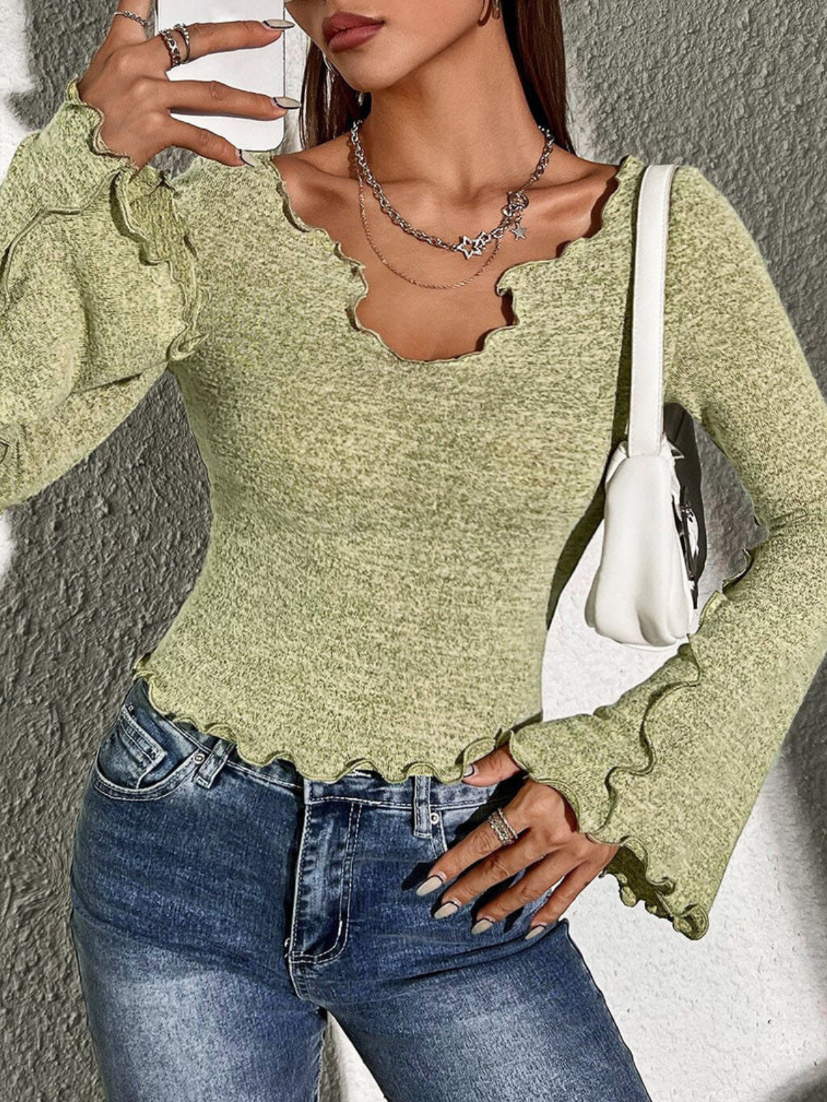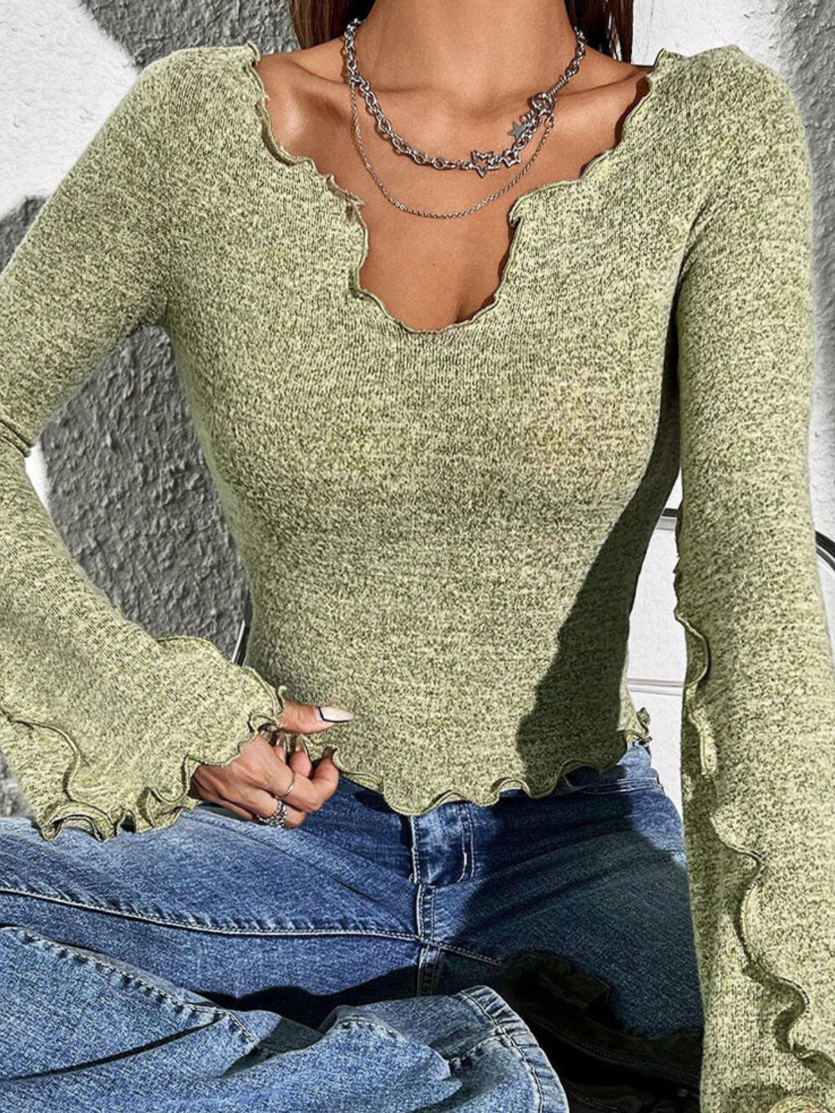 Ruffle Trim Flared Sleeve Slim Top